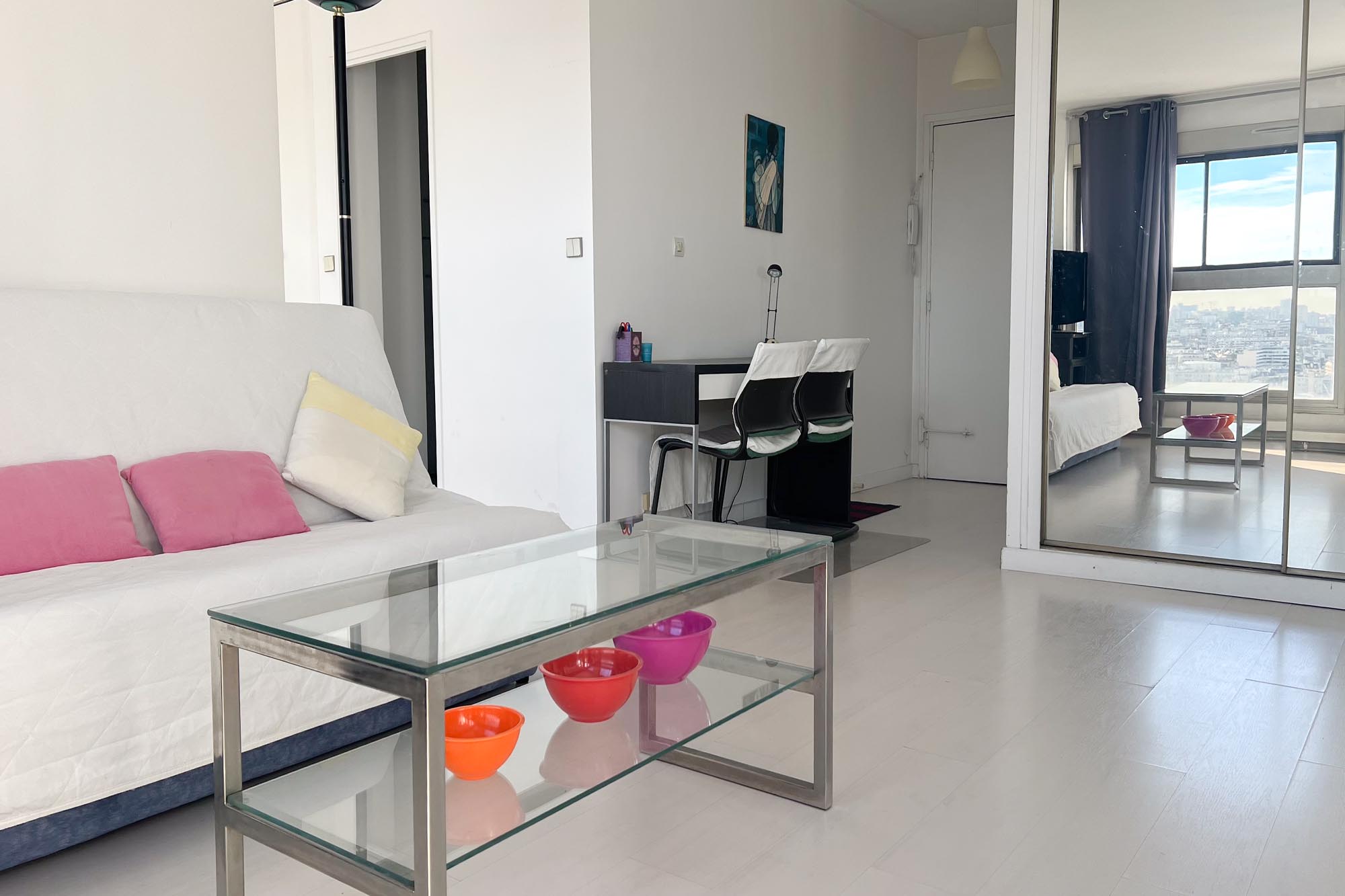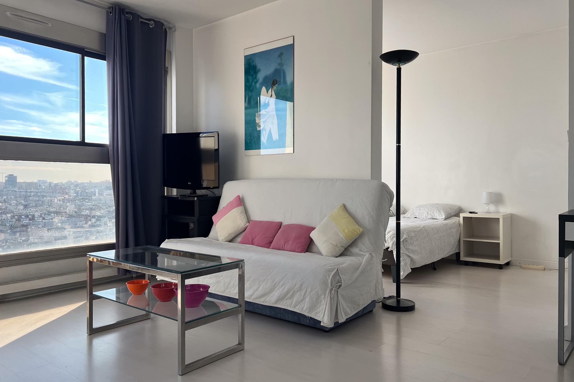 Pont Mirabeau, Métro Javel, dans un immeuble de bon standing avec gardiens, vue panoramique pour ce grand 2 pièces meublé de 52m² au 22ème étage comprenant; entrée, wc séparés, séjour très lumineux, cuisine semi-ouverte équipée, une chambre avec rangements, salle de bains.